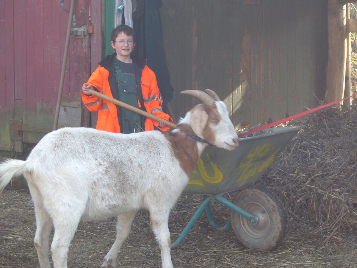 Auf dem Karcherhof leben die meisten unserer Tiere. Im großen zentralen Offenstall fühlen sich Rinder, Schafe und Ziegen wohl, während die Pferde ihren eigenen Stall mit sonniger Weide bewohnen. Hühner, Hunde und Katze runden das bunte Treiben ab.